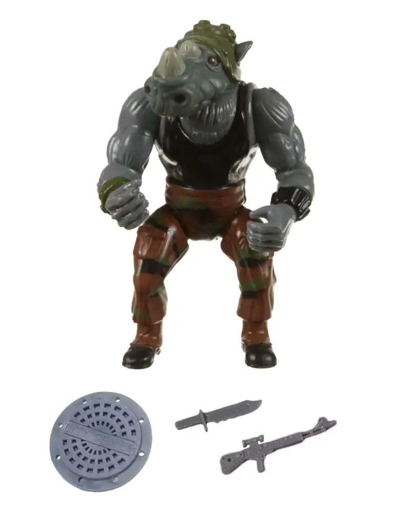 Rocksteady, the mutant rhino enforcer of Shredder’s clan, brought muscle and menace in equal measure. A former street thug transformed by mutagen ooze, Rocksteady embodied the brute-force strategy of the Foot—smash first, ask questions never. His figure stood out among the villains with its intimidating sculpt: armor-plated snout, striped camo pants, and hefty frame. Paired with Bebop, he was the perfect foil to the Turtles’ nimble ninja finesse, and a nostalgic anchor for fans who remember the bumbling brawn of Saturday morning battles.