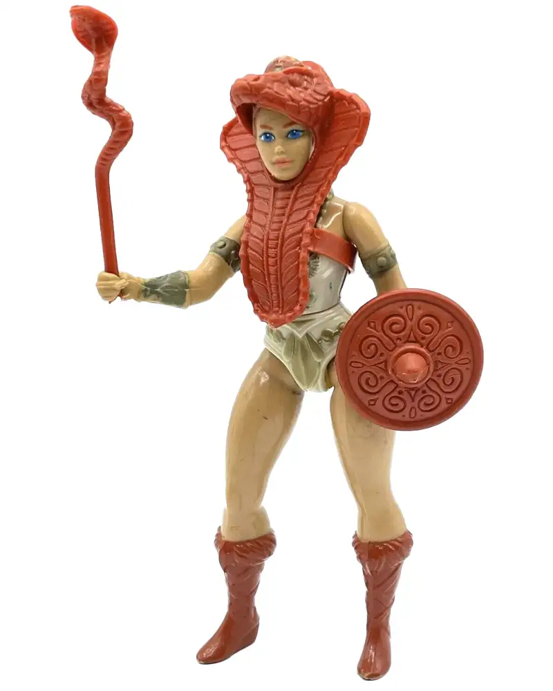 The snake armor and staff hint at her mystical roots, but the same sculpt was later reused for other female figures like The Sorceress and Evil-Lyn with color and accessory changes. The cobra headdress is often missing in loose examples, and complete figures with unbroken staff and intact snake armor are becoming harder to find, making her a mid-range collectible with strong nostalgic pull.